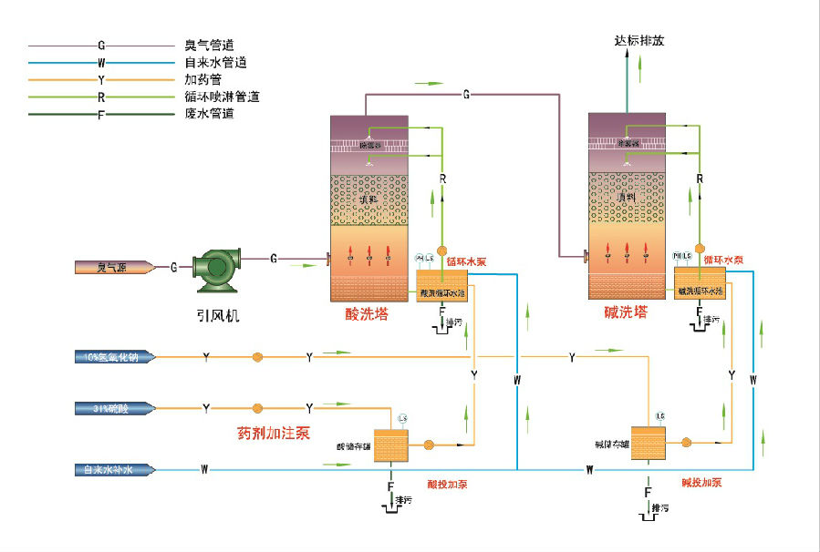 填充床濕式吸收器是最常用的化學(xué)洗滌塔,有順流、逆流和錯(cuò)流等方式。如逆流循環(huán)式填充塔中,惡臭氣體從吸收塔底部進(jìn)入,通過(guò)填料空隙向上運(yùn)行,與從塔頂部進(jìn)入并噴淋到填料上的吸收液接觸而被吸收,隨吸收液降落到填充塔下部。經(jīng)過(guò)處理后的潔凈空氣從廢氣吸收塔上端排氣管進(jìn)入大氣。為了徹底去除廢氣中的惡臭物質(zhì),化學(xué)洗滌除臭通常采用酸洗與堿洗相串聯(lián)的多級(jí)化學(xué)洗滌方式脫臭。典型流程圖如下。