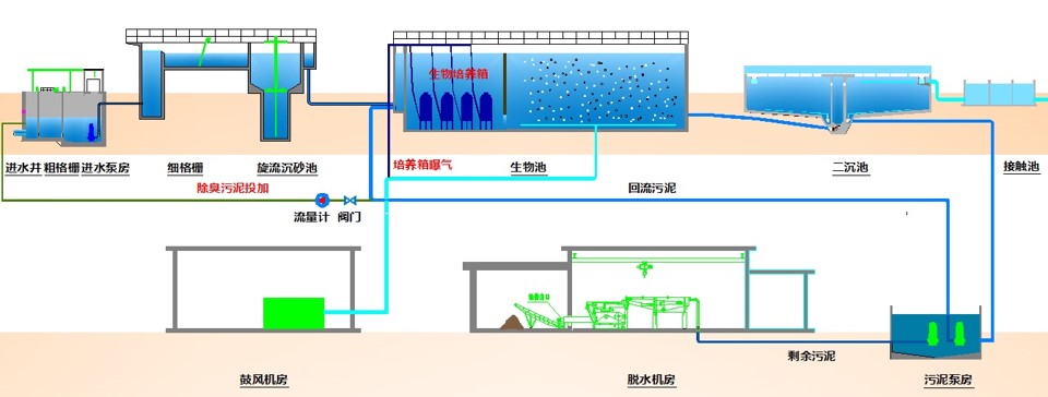 全過程除臭是一種應(yīng)用于污水處理廠的原位減臭技術(shù),通過在污水處理廠生物池內(nèi)設(shè)置培養(yǎng)箱,利用生物填料及活性污泥混合液促進除臭微生物的生長、增殖,最后將二沉池的活性污泥按一定比例回流到污水廠進水端,利用除臭微生物對污水中的惡臭物質(zhì)進行吸附和生物降解,去除部分惡臭物質(zhì),實現(xiàn)污水廠惡臭的全過程控制。
