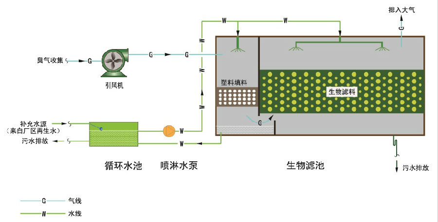 來自收集系統(tǒng)的臭氣通過風機進入預洗池,洗去部分水溶性物質(zhì)和灰塵,并調(diào)節(jié)氣體溫度。經(jīng)過充分預洗的臭氣進入生物濾池,經(jīng)過微生物濾料層對惡臭物質(zhì)的吸附、吸收和降解,分解為滿足達標排放的氣體,由排氣口排入大氣。
