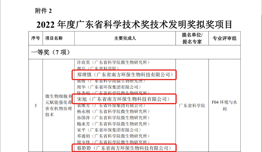 廣東省科學(xué)技術(shù)廳發(fā)布《2022年度廣東省科學(xué)技術(shù)獎(jiǎng)擬獎(jiǎng)公示》,公示名單中南方環(huán)保參與研究項(xiàng)目“微生物細(xì)胞多元賦能強(qiáng)化毒害有機(jī)物治理技術(shù)”榮獲技術(shù)發(fā)明獎(jiǎng)一等獎(jiǎng)!