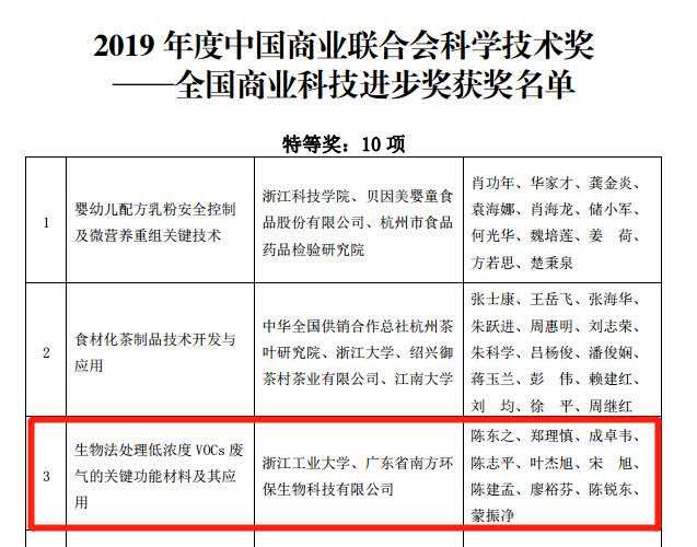 11月1日,2020年全國商業(yè)質(zhì)量大會在北京召開。大會對“2019年度中國商業(yè)聯(lián)合會科學技術(shù)獎”獲獎單位進行頒獎,南方環(huán)保與浙江工業(yè)大學的聯(lián)合申報項目《生物法處理低濃度VOCs廢氣的關(guān)鍵功能材料及其應用》榮獲“全國商業(yè)科技進步獎”特等獎。