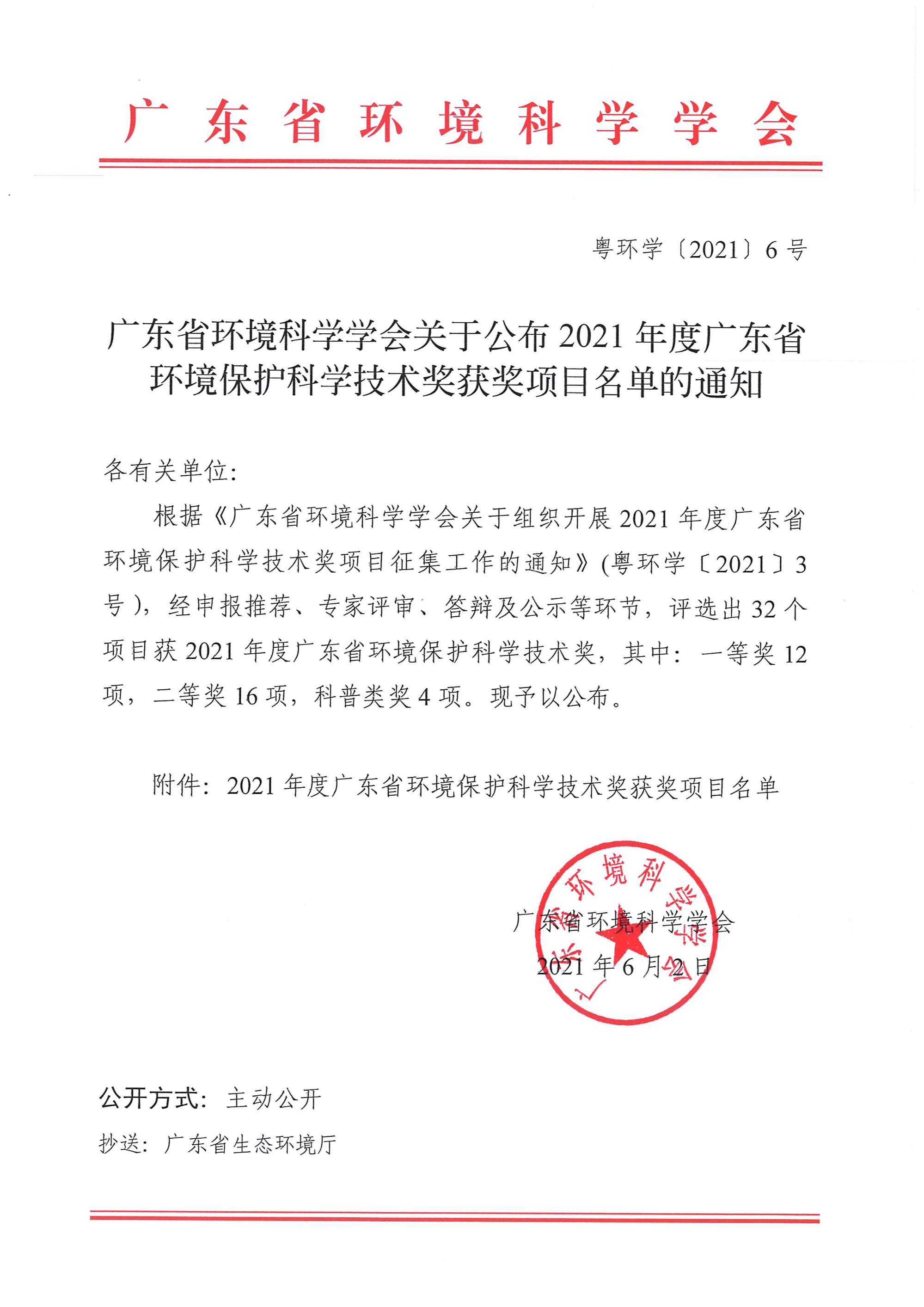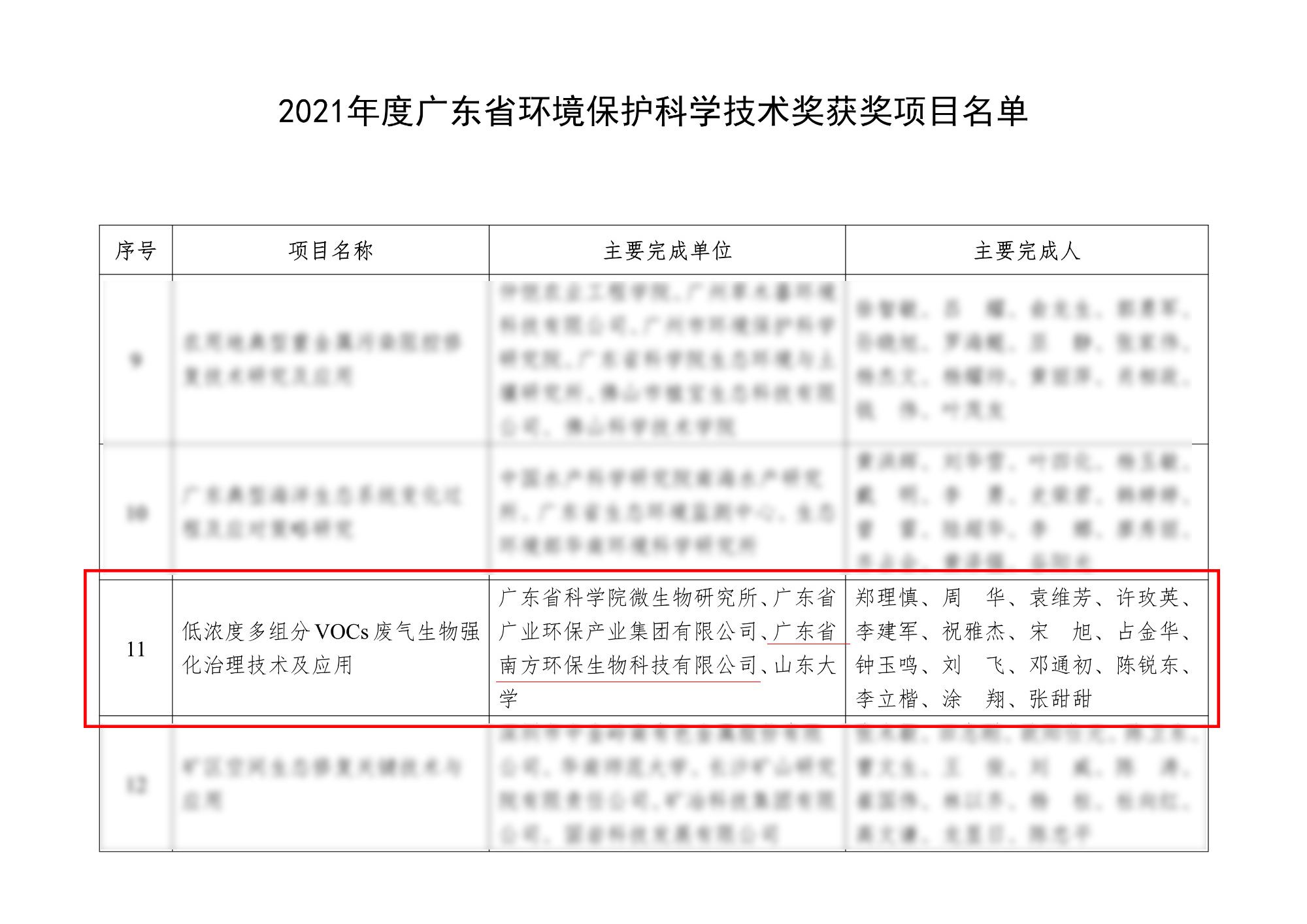 6月2日,廣東省環(huán)境科學(xué)學(xué)會(huì)正式公布了“2021年度廣東省環(huán)境保護(hù)科學(xué)技術(shù)獎(jiǎng)獲獎(jiǎng)項(xiàng)目名單”,南方環(huán)保參與研發(fā)的“低濃度多組分VOCs廢氣生物強(qiáng)化治理技術(shù)及應(yīng)用”項(xiàng)目榮獲廣東省環(huán)境保護(hù)科學(xué)技術(shù)一等獎(jiǎng)。